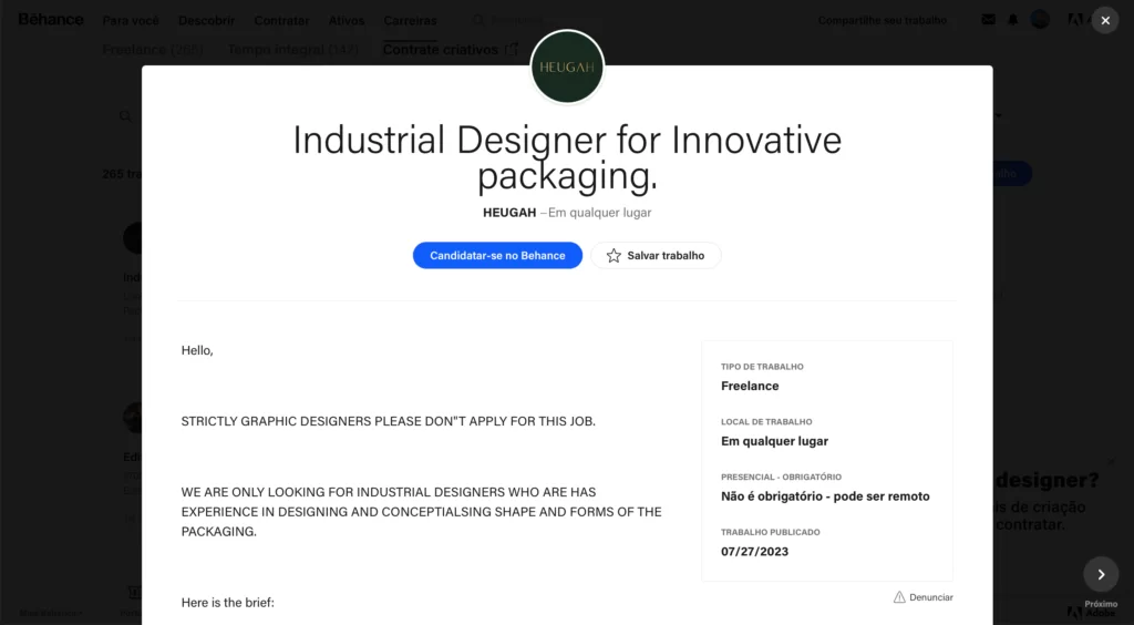 Na aba Carreiras (joblist) é possível acessar oportunidades de trabalho no próprio Behance. O “Carreiras” é uma seção da plataforma onde empresas, estúdios e empregadores podem publicar anúncios de emprego, vagas de estágio ou projetos freelance para os profissionais criativos. Nessa seção, os usuários podem procurar por oportunidades de carreira ou projetos freelance que estejam alinhados com suas habilidades, interesses e localização geográfica.